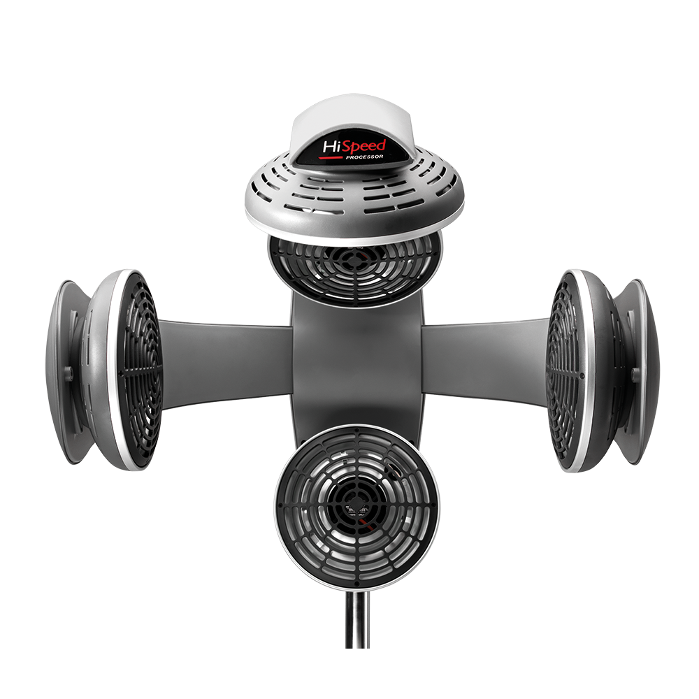 Hi-Speed is een veelzijdige climazon die zowel technische behandelingen als droogprogramma’s kan uitvoeren met dezelfde precisie en efficiëntie. Deze resultaten worden bereikt dankzij de sterke punten van het apparaat: de plaatsing van het verwarmingspunt, de verwerkingssnelheid instelbaar op 8 niveaus, de driestaps ventilatie van elk punt, de mogelijkheid om elk punt uit te schakelen wanneer het niet nodig is, de overzichtelijke displayweergave en de enkele instelknop.