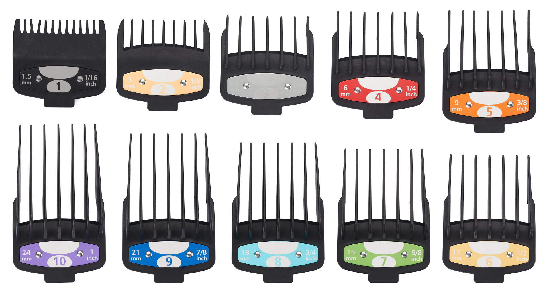 10 metalen opzetkammen: 1.5 / 3 / 4.5 / 6 / 9 / 12 / 15 / 18 / 21 / 24 mm