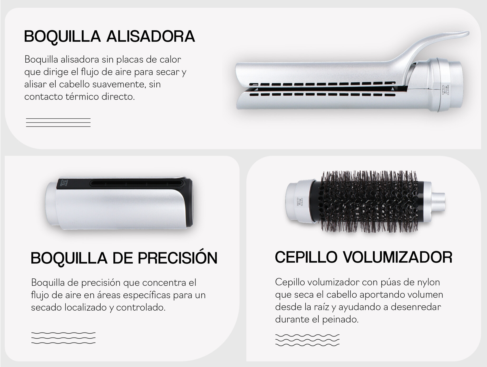 - Inclusief 5 opzetstukken voor drogen, krullen, volume en stijlen