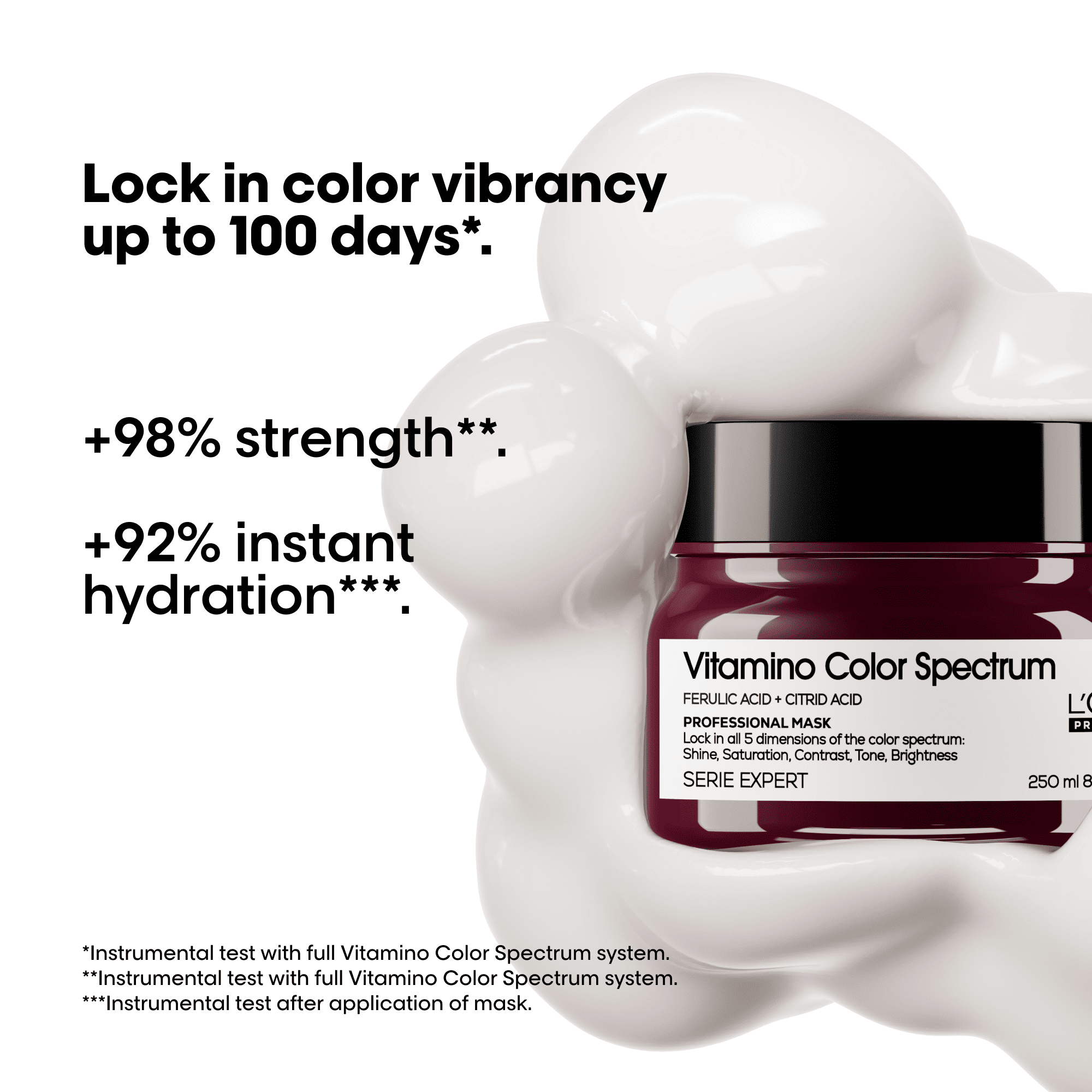 L’Oréal Professionnel Vitamino Color Spectrum Masker is een luxe, hydraterend masker speciaal ontwikkeld voor gekleurd haar. De krachtige formule, verrijkt met ferulinezuur en citroenzuur, helpt kleurintensiteit tot wel 100 dagen* vast te houden door de vezel te beschermen en te versterken. Dit masker heeft effect op de vijf dimensies van haarkleur: ultra-hoge glans, rijke verzadiging, optimaal contrast, neutrale tonen en helderheid. De rijke crèmige textuur hydrateert intens en maakt het haar sterker en soepeler. Resultaat: langdurig levendige kleuren met zichtbaar gezonder en soepeler haar. *Instrumentele test met de volledige Vitamino Color Spectrum-lijn.