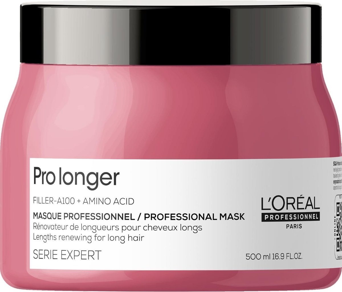 L'Oréal Professionnel Serie Expert Pro Longer Haarmasker is een intens versterkend en verdikkend haarmasker voor lang haar dat kracht, volume en glans mist. Het innovatieve, gepatenteerde aminozuur Filler A-100 zorgt ervoor dat de haarvezel van binnenuit wordt gevuld, waardoor het haar zichtbaar versterkt en voller wordt. Het masker helpt haarbreuk tot wel 69%* voorkomen en zorgt ervoor dat lang haar op een gezonde manier een nog langere lengte kan bereiken. Dunne, breekbare punten worden opgevuld en het haar splijt minder snel.