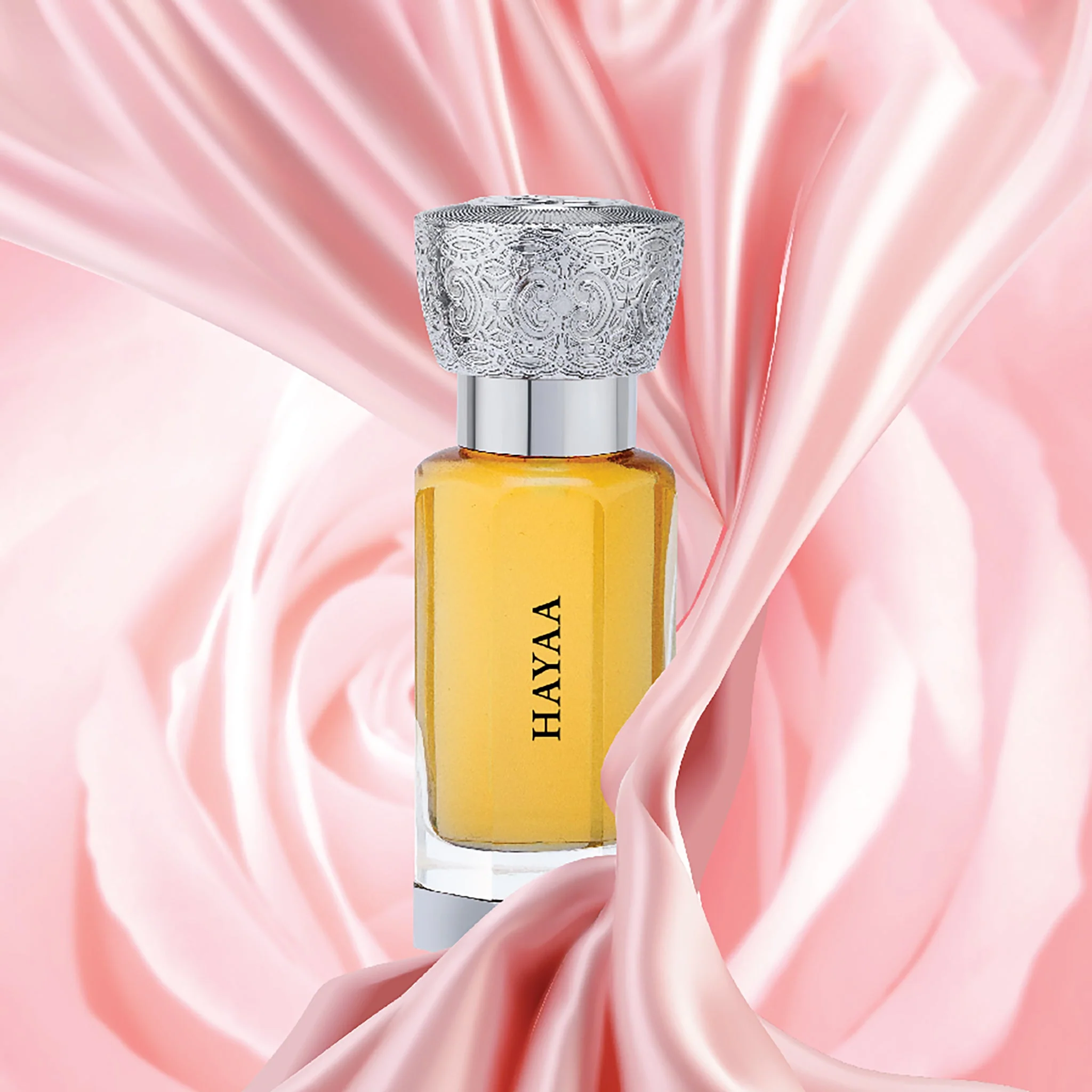 Hayaa is ontworpen om de schoonheid van liefde op een winterse dag te belichamen. De geur zal de herinnering aan een oprechte en onvergetelijke uitstraling vastleggen. Hayaa wekt je diepste dromen, met zijn verleidelijke geur van zijdezachte witte amber. De tonen van roos vormen een perfecte symfonie met een delicate blos. Je houdt romige toppen van witte bloemen in je armen terwijl een gouden aura van oudh je omhult. Het zachte hout en de zachte musk omringen je met een fluwelen gloed. Je begint en eindigt je dag in een zachte omhelzing, verteld door de geur van Hayaa. Hayaa wordt geleverd in een rollerbal van 12 ml voor eenvoudig aanbrengen en is een unisex-geur. Het geheim achter de glimlach.